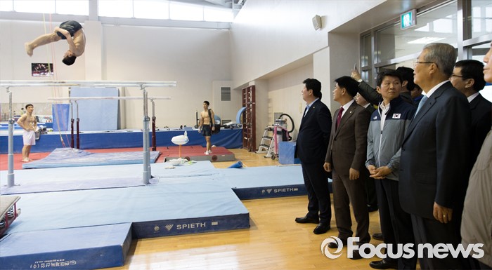 (서울=포커스뉴스) 리우데자네이루 하계올림픽을 52일여 앞둔 14일 오후 서울 노원구 태릉선수촌을 방문한 김종인 더불어민주당 비상대책위원회 대표가 기계체조 국가대표 선수들의 훈련모습을 지켜보고 있다.