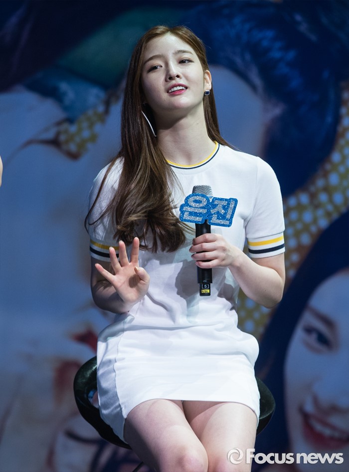 (서울=포커스뉴스) 14일 오후 서울 마포구 롯데카드 아트센터에서 열린 걸그룹 다이아의 두번째 앨범 'HAPPY ENDING' 발표 쇼케이스에 참여한 멤버 은진이 머리카락을 정돈하고 있다.