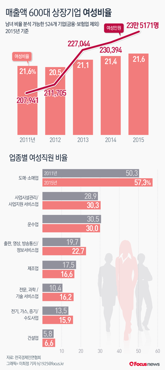 (서울=포커스뉴스) 14일 전국경제인연합회가 매출액 600대 상장기업(금융·보험업 제외) 남녀 비율을 분석한 결과, 2015년 여성비율은 21.6%였다. 2015년 기준 업종별로는 도매 및 소매업의 여성비율이 57.3%로 가장 높았던 반면 건설업은 6.6%에 불과했다.