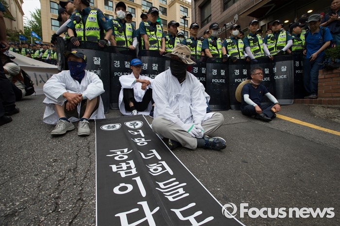 (서울=포커스뉴스) 14일 오후 유성기업 노동자 故 한광호씨의 분향소를 양재동 현대차 본사 앞으로 옮기는 꽃길 100리 행진 2일째에 참여한 노동자들이 국회를 출발해 한남동 현대차 정몽구 회장 집으로 향하던 길에 경찰과 대치하고 있다.
