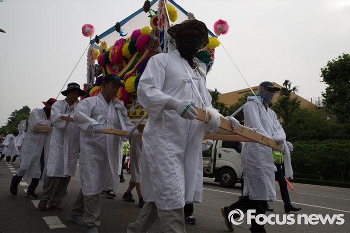 (서울=포커스뉴스) 14일 오후 유성기업 노동자 故 한광호씨의 분향소를 양재동 현대차 본사 앞으로 옮기는 꽃길 100리 행진 2일째에 참여한 노동자들이 국회를 출발해 한남동 현대차 정몽구 회장 집으로 행진하고 있다.