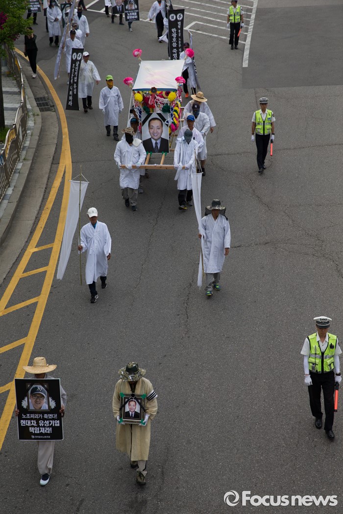(서울=포커스뉴스) 14일 오후 유성기업 노동자 故 한광호씨의 분향소를 양재동 현대차 본사 앞으로 옮기는 꽃길 100리 행진 2일째에 참여한 노동자들이 국회를 출발해 한남동 현대차 정몽구 회장 집으로 행진하고 있다.
