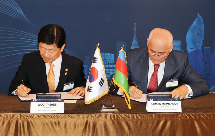 (서울=포커스뉴스) 우태희 산업통상자원부 2차관(수석대표)이 14일 서울 소공동 롯데호텔 벨뷰스위트룸에서 맘마모브(Mammamov) 아제르바이잔 통신첨단기술부 차관(수석대표)과 함께 제1차 한-아제르바이잔 경제공동위원회 합의록 서명식을 갖고 있다. <사진제공=산업통상자원부>