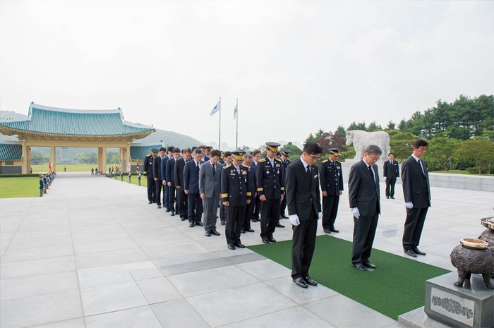 (대전=포커스뉴스) 국민안전처 직원들이 호국보훈의 달을 맞아 14일 대전현충원을 찾아 순국선열 및 호국영령에 대해 참배하고 있다. <사진제공=국민안전처>