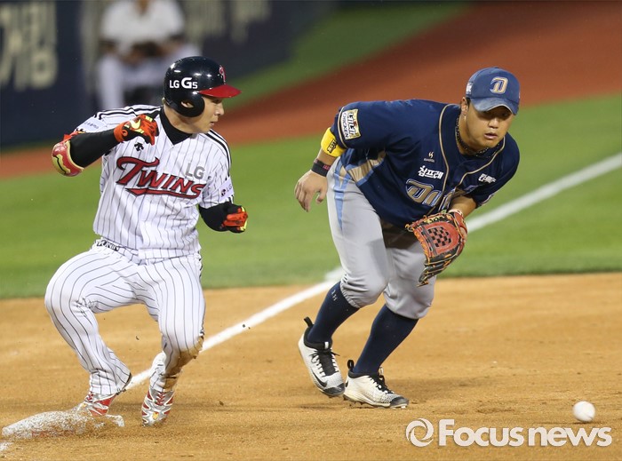 (서울=포커스뉴스) 14일 서울 잠실구장에서 열린 2016 프로야구 NC-LG 경기 4회말 1사 1루에서 LG 오지환이 좌익수앞 3루타를 치고 3루에서 세이프되고 있다.