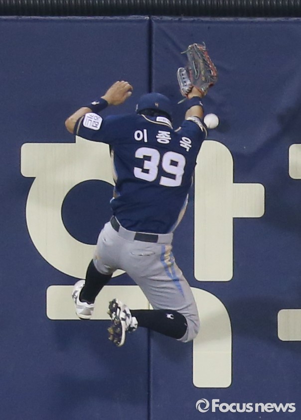 (서울=포커스뉴스) 14일 서울 잠실구장에서 열린 2016 프로야구 NC-LG 경기 8회말 2사 1루에서 NC 중견수 이종욱이 LG 박용택의 타구를 잡으려 펜스 앞에서 점프했으나 놓치고 있다.