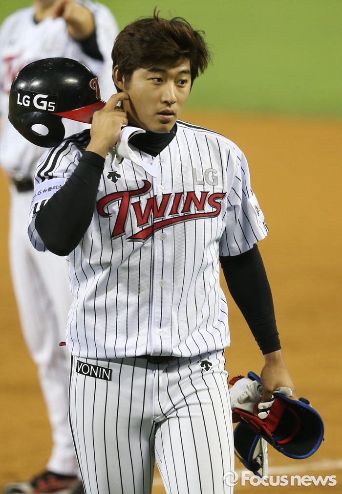 (서울=포커스뉴스) 14일 서울 잠실구장에서 열린 2016 프로야구 NC-LG 경기 9회말 무사 1,2루에서 LG 대타 서상우가 1타점 우전 안타를 치고 대주자와 교체돼 덕아웃으로 들어가고 있다.