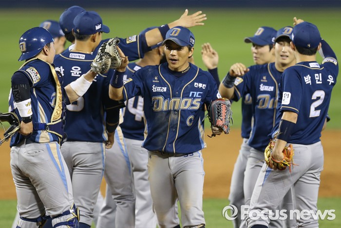 (서울=포커스뉴스) 14일 서울 잠실구장에서 열린 2016 프로야구 NC-LG 경기에서 9회에 대량 득점하며 LG에 역전승하며 11연승한 NC 선수들이 마운드에서 하이파이브하고 있다.