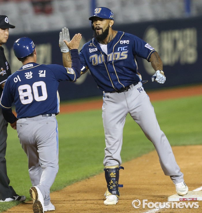 | △ 역전 3루타 치고 환호하는 NC 테임즈 |
