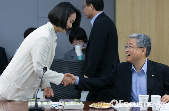 (서울=포커스뉴스) 15일 오전 서울 여의도 국회 의원회관에서 열린 15차 국민의당 정책역량강화 집중 워크숍에 참석한 김수민(왼쪽), 김동철 의원이 인사하고 있다.