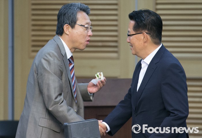 (서울=포커스뉴스) 15일 오전 서울 여의도 국회 의원회관에서 열린 15차 국민의당 정책역량강화 집중 워크숍에 참석한 박지원(오른쪽) 원내대표와 김성식 정책위의장이 인사하고 있다.