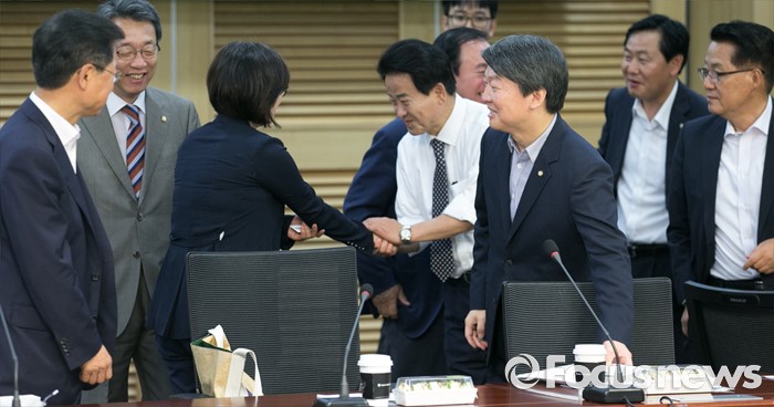(서울=포커스뉴스) 15일 오전 서울 여의도 국회 의원회관에서 열린 15차 국민의당 정책역량강화 집중 워크숍에 참석한 안철수 상임공동대표, 천정배 공동대표, 박지원 원내대표 등 의원들이 인사하고 있다.