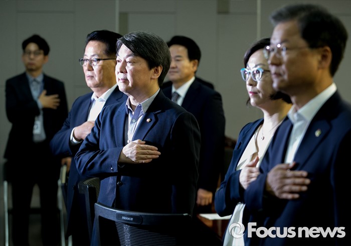 (서울=포커스뉴스) 15일 오전 서울 여의도 국회 의원회관에서 열린 15차 국민의당 정책역량강화 집중 워크숍에 참석한 천정배(앞줄 오른쪽부터) 공동대표, 이나영 중앙대 사회학과 교수, 안철수 상임공동대표, 박지원 원내대표 등 의원들이 국기에 대한 경례를 하고 있다.