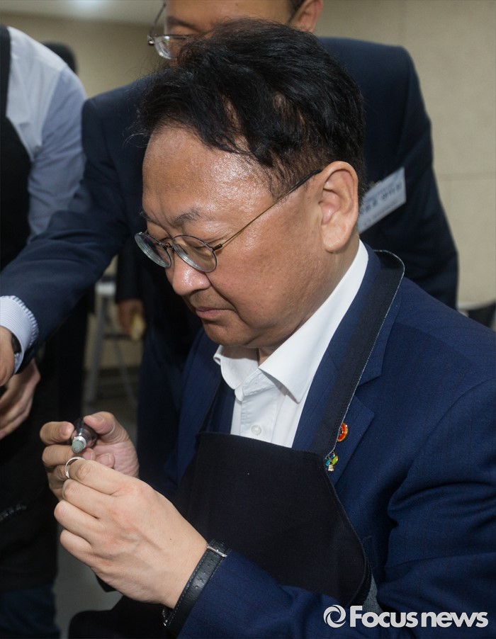 (서울=포커스뉴스) 유일호 경제부총리 겸 기획재정부 장관이 15일 오전 서울 종로구 서울창조경제혁신센터 부속 인큐베이팅 센터에서 입주기업을 둘러보던 중 보석 세공 작업을 체험하고 있다.