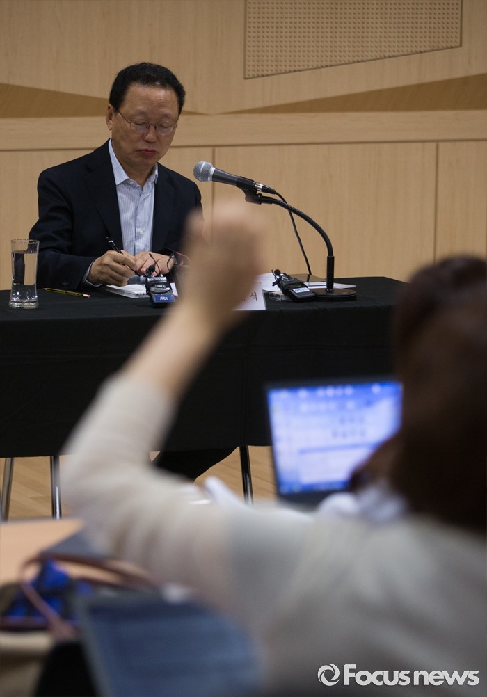 (서울=포커스뉴스) 15일 오전 서울 종로구 세종문화회관 서울시립교향악단 연습실에서 최흥식 서울시향 대표가 기자간담회에 참석해 취재진에게 질문을 받고 있다.