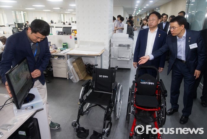 (서울=포커스뉴스) 유일호 경제부총리 겸 기획재정부 장관이 15일 오전 서울 종로구 서울창조경제혁신센터 부속 인큐베이팅 센터에서 입주기업을 둘러보던 중 낙상 방지 휠체어 설명을 듣고 있다.