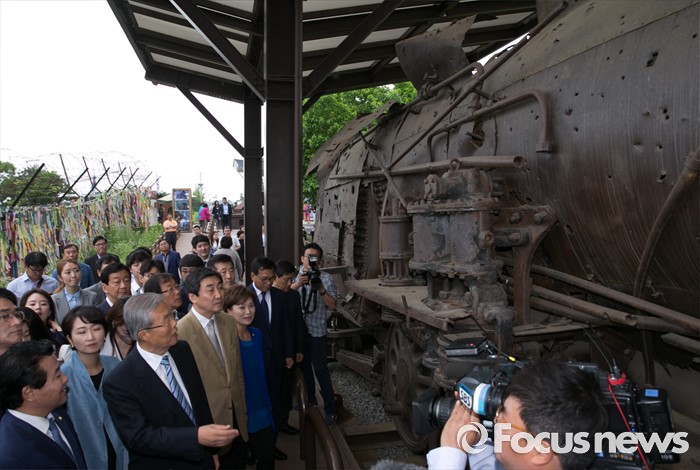 (파주=포커스뉴스) 15일 오전 경기도 파주 임진각 통일전망대에서 더불어민주당 비상대책위원회의를 마친 김종인 비대위 대표와 의원들이 전시된 경의선 장단역 증기기관차를 둘러보고 있다.