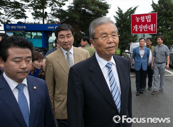 (파주=포커스뉴스) 15일 오전 경기도 파주 임진각 통일전망대에서 더불어민주당 비상대책위원회의를 마친 김종인 비대위 대표와 의원들이 이동하고 있는 모습 뒤로 한 단체 관계자가 농협법 개정반대 피켓을 들고 있다.