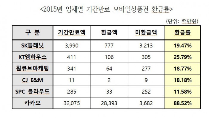 실제 카카오는 2014년 7월부로 직접영업을 시작하면서 이용자들이 기간만료 상품권을 쉽게 환급 받을 수 있는 독자적 시스템을 마련했고 이후 환급률이 90%에 육박했다. 기간만료 금액이 압도적으로 큼에도 불구하고 88%를 상회하는 높은 환급률을 보인 셈이다.