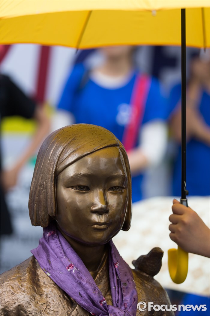 (서울=포커스뉴스) 15일 오후 서울 종로구 옛 일본대사관 앞에서 열린 제1235차 일본군 위안부 문제해결을 위한 정기 수요집회 참석한 한 학생이 소녀상에게 우산을 씌어주고 있다.