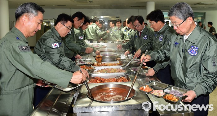 (오산=포커스뉴스) 김희옥 새누리당 혁신비상대책위원장, 정진석 원내대표 등 의원들이 15일 오후 경기도 오산 공군작전사령부를 방문해 오찬을 위해 배식하고 있다.