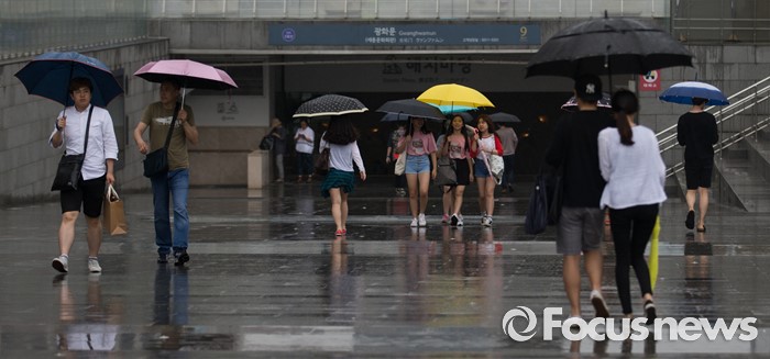 (서울=포커스뉴스) 전국적으로 비가 내리는 15일 오후 서울 종로구 광화문광장을 지나는 시민들이 비를 피해 발걸음을 재촉하고 있다.
