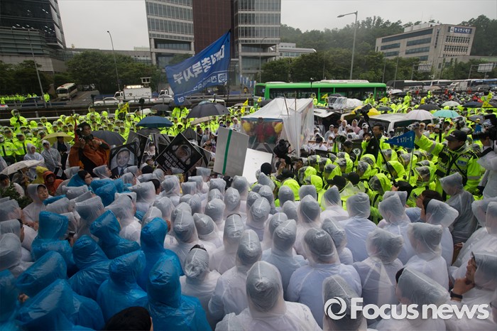 (서울=포커스뉴스) 15일 오후 유성기업 노동자 故 한광호씨의 분향소를 양재동 현대차 본사 앞으로 옮기는 꽃길 100리 행진에 참여한 노동자들이 현대차 본사 앞으로 들어서 분향소 설치로 인해 경찰과 유성 범대위 사람들이 대치하고 있다.
