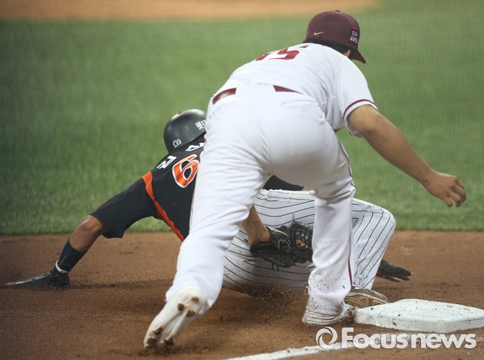 (서울=포커스뉴스) 15일 서울 고척 스카이돔 구장에서 열린 2016 프로야구 롯데-넥센 경기 6회초 1사 1,3루에서 롯데 1루주자 김상호가 정훈의 유격수 앞 땅볼때 3루까지 뛰어 세이프되고 있다.