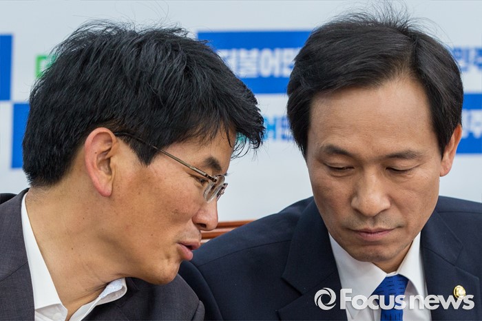 (서울=포커스뉴스) 우상호(오른쪽) 더불어민주당 원내대표와 박완주 원내수석부대표가 16일 오전 서울 여의도 국회에서 열린 정책조정회의에 참석해 대화를 나누고 있다.