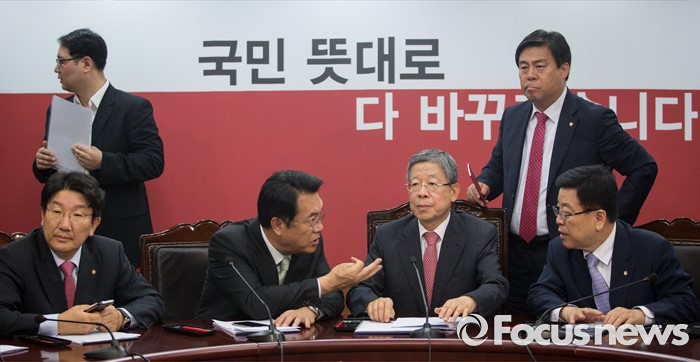 (서울=포커스뉴스) 김희옥(가운데) 새누리당 혁신비상대책위원장과 정진석(왼쪽) 원내대표가 무소속 복당 문제를 논의하기 위해 16일 오전 서울 여의도 당사에서 김광림 정책위의장과 함께 혁신비상대책위원 회의를 하고 있다. 왼쪽은 권성동 사무총장.