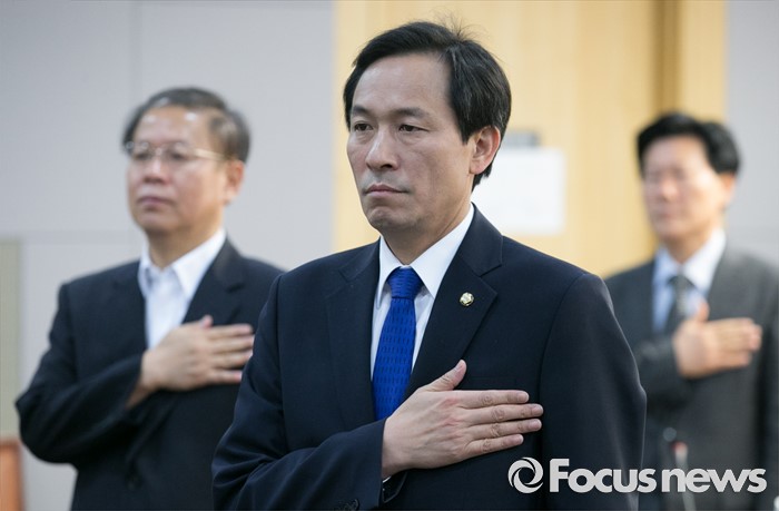 (서울=포커스뉴스) 16일 오전 서울 여의도 국회 의원회관에서 열린 남북경제협력사업 중단에 따른 손실보상에 관한 특별법안 토론회에 참석한 우상호 더불어민주당 원내대표 등 참석자들이 국기에 대한 경례를 하고 있다.