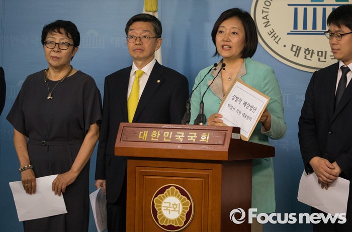(서울=포커스뉴스) 16일 오전 서울 여의도 국회 정론관에서 박영선 더불어민주당 의원이 가습기 살균제 피해와 같은 대기업의 반사회적 불법행위를 막기 위한 '징벌적 배상법' 제정안 발의에 대한 기자회견을 하고 있다.