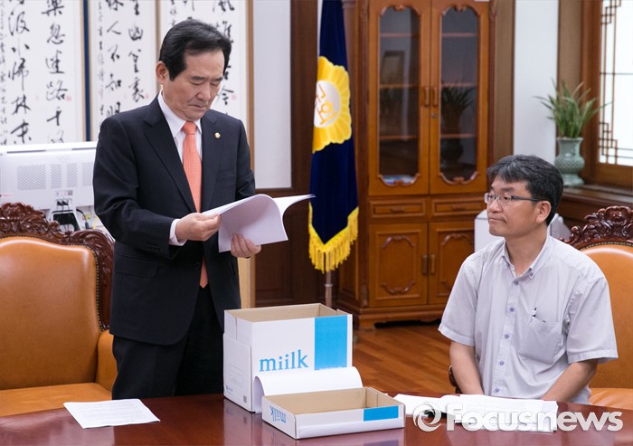 (서울=포커스뉴스) 정세균(왼쪽) 국회의장이 16일 오전 서울 여의도 국회 의장집무실을 방문한 이정미 정의당 원내수석부대표, 가습기살균제 피해자와 가족모임과 면담에 앞서 전달받은 서명지를 살펴보고 있다.