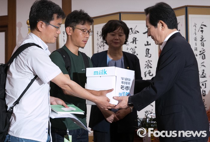 (서울=포커스뉴스) 정세균(오른쪽 첫번째) 국회의장이 16일 오전 서울 여의도 국회 의장집무실을 방문한 이정미(오른쪽 두번째) 정의당 원내수석부대표, 가습기살균제 피해자와 가족모임으로부터 대책마련 대국민 서명지를 전달받고 있다.