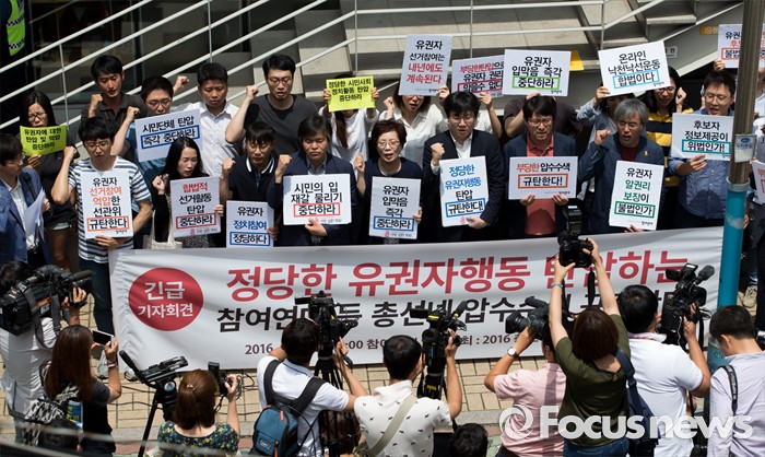 (서울=포커스뉴스) 16일 오전 서울 종로구 참여연대 앞에서 2016총선시민네트워크와 참여연대가 시민단체 압수수색을 규탄하는 기자회견을 하고 있다.