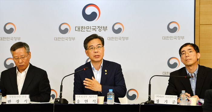 (서울=포커스뉴스) 송언석 기획재정부 차관이 6월 16일 정부서울청사에서 열린 '2015년도 공공기관 경영평가결과 및 후속 조치'와 관련하여 브리핑을 하고 있다. 외쪽부터 반장식 경영평가 단장, 송언석 차관, 정기준 기재부 공공정책국장. <사진제공=기획재정부>