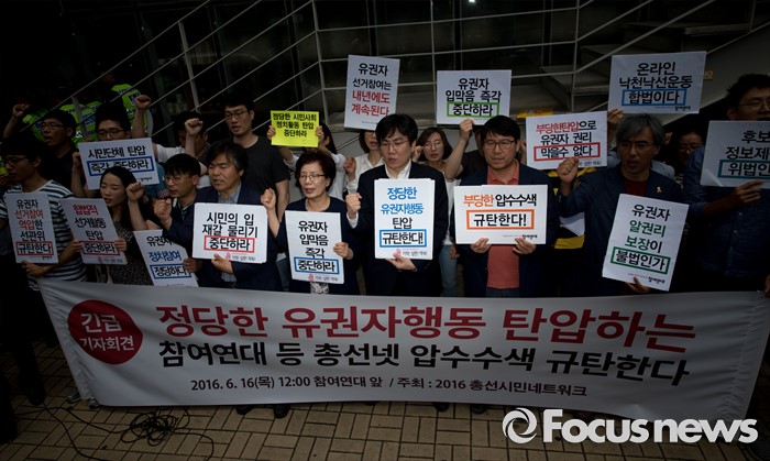 (서울=포커스뉴스) 16일 오전 서울 종로구 참여연대 앞에서 2016총선시민네트워크와 참여연대가 시민단체 압수수색을 규탄하는 기자회견을 하고 있다.