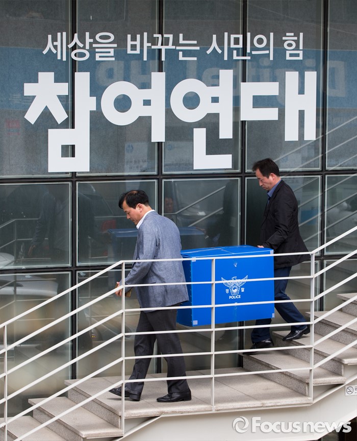 (서울=포커스뉴스) 공직선거법 위반 혐의를 수사하고 있는 경찰이 16일 오후 서울 종로구 참여연대 압수수색을 마치고 차량으로 압수품을 옮기고 있다.