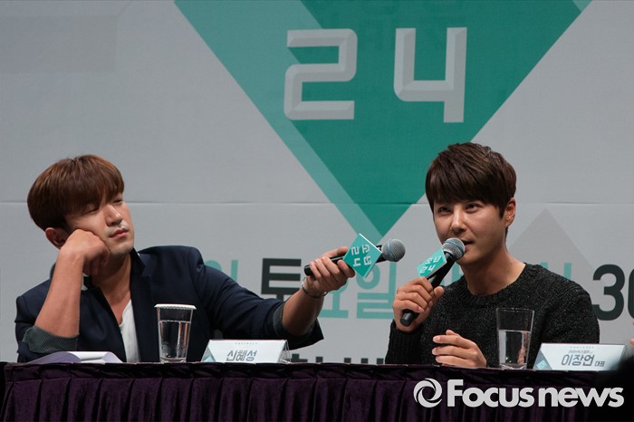 (서울=포커스뉴스) 16일 오후 서울 여의도구 63빌딩 그랜드볼룸에서 열린 보이그룹 오디션 프로그램 '소년24 프로젝트' 제작발표회에 참석한 그룹 신화의 신혜성(오른쪽)이 기자들의 질문에 답하고 있다.