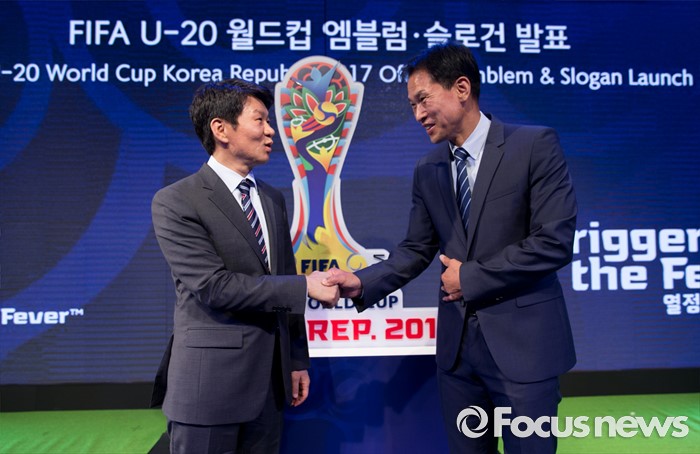 (서울=포커스뉴스) 16일 오후 서울 종로구 올레스퀘어에서 열린 FIFA U-20 월드컵 엠블럼·슬로건 발표 행사에서 정몽규(왼쪽) FIFA U-20 월드컵 조직위원장과 안익수 U-19 청소년대표팀 감독이 악수를 나누고 있다.