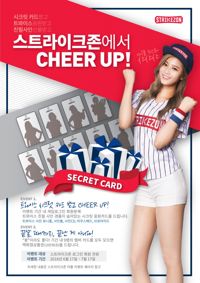 이번 프로모션은 자사의 스크린야구 브랜드 스트라이크존의 앱 업데이트를 기념하기 위해 진행되는 행사다. 스트라이크존 앱을 설치하고 경기를 한 후 로그인 화면만 보여주면 즉석에서 트와이스 시크릿카드가 지급된다.