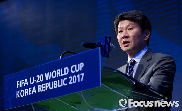 (서울=포커스뉴스) 16일 오후 서울 종로구 올레스퀘어에서 열린 FIFA U-20 월드컵 엠블럼·슬로건 발표 행사에서 정몽규 FIFA U-20 월드컵 조직위원장이 환영사를 하고 있다.