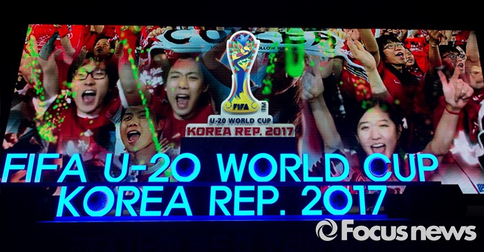 (서울=포커스뉴스) 16일 오후 서울 종로구 올레스퀘어에서 FIFA U-20 월드컵 엠블럼·슬로건이 발표되고 있다.