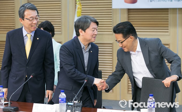 (서울=포커스뉴스) 16일 오후 서울 여의도 국회 의원회관에서 열린 '누리과정 갈등 어떻게 풀 것인가' 토론회에 참석한 안철수(가운데) 국민의당 상임공동대표와 박지원(오른쪽) 원내대표가 인사하고 있다. 왼쪽은 김성식 정책위의장.