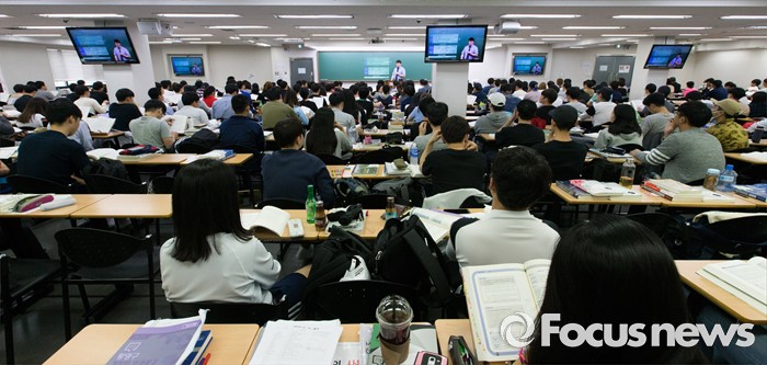 (서울=포커스뉴스) 지방직 9급 공무원 필기시험을 이틀 앞둔 15일 오후 서울 동작구 공단기 노량진학원에서 시험 응시자들이 강의을 듣고 있다.