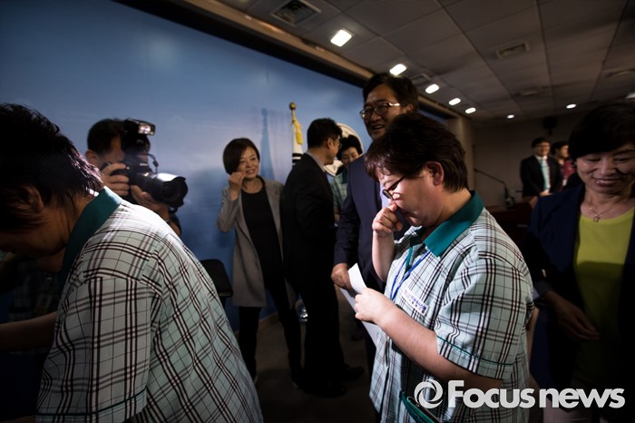 (서울=포커스뉴스) 국회환경미화노동조합원이 16일 오후 서울 여의도 국회에서 정세균 국회의장의 국회 환경미화원 직접고용 입장 발표에 환영의 뜻을 밝히는 기자회견을 마친 뒤 눈물을 닦고 있다.