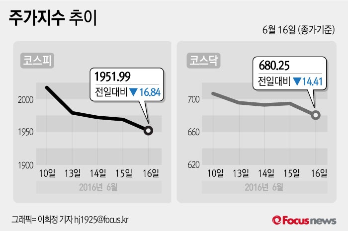 (서울=포커스뉴스) 16일 코스피지수는 전날 보다 0.86%(16.84포인트) 내린 1951.99에 장을 마쳤다. 코스닥지수는 전일 대비 2.07%(14.41포인트) 내린 680.25에 마감했다.