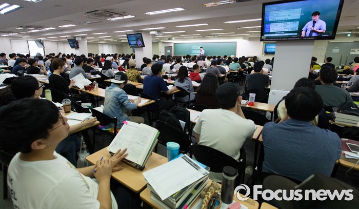 (서울=포커스뉴스) 지방직 9급 공무원 필기시험을 이틀 앞둔 15일 오후 서울 동작구 공단기 노량진학원에서 시험 응시자들이 강의을 듣고 있다.