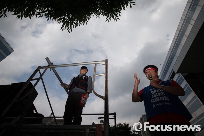 (서울=포커스뉴스) 이틀 전 총파업을 결의한 대우조선해양 노조가 16일 오후 서울 여의도 산업은행 앞에서 사측의 일방적 구조조정에 반대하며 상경투쟁을 벌이고 있다.