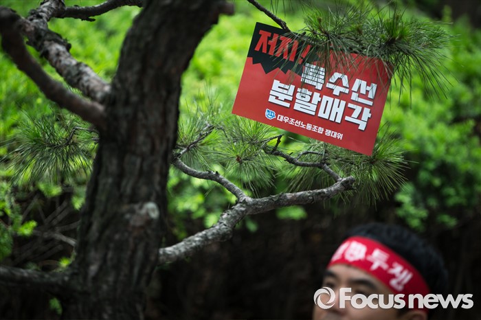 (서울=포커스뉴스) 이틀 전 총파업을 결의한 대우조선해양 노조가 16일 오후 서울 여의도 산업은행 앞에서 사측의 일방적 구조조정에 반대하며 상경투쟁을 벌이고 있다.